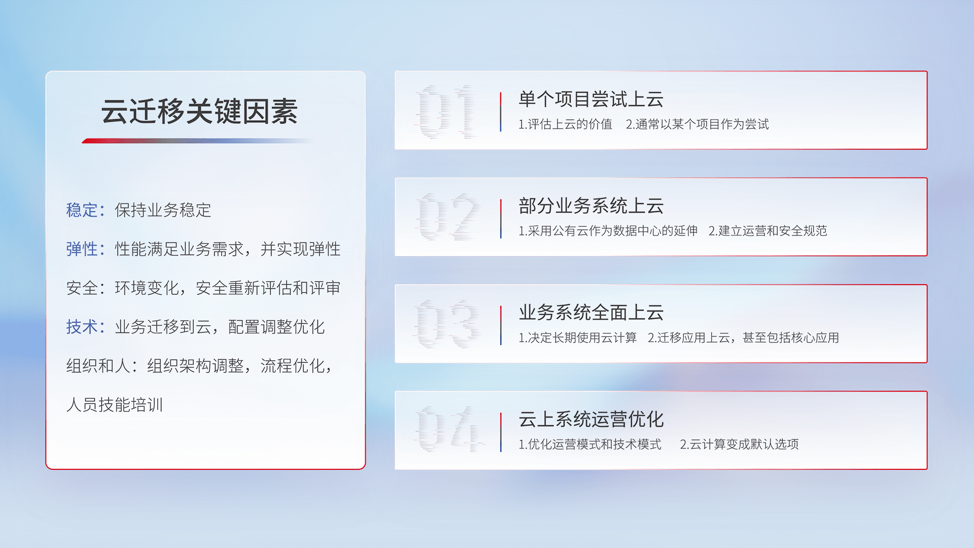 结合实际业务,,从规划设计、、云平台选型、、、云原生改造、、、、数据迁移、、、集成交付,,迁移全过程为客户识别最佳上云路径,,做好风险识别管理,,,,设计网络架构、、、身份权限、、、安全审计合规、、、、操作审计、、日志审计、、、、监控告警策略、、、多站点容灾设计等,,,对云上基础设施进行整体规划,,,,提升IT治理水平,,以满足弹性、、、、高可用、、、高性能的需求。。。