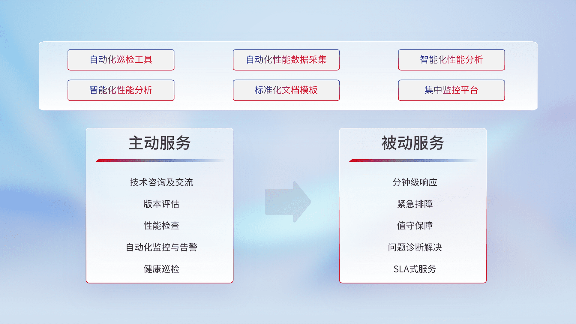 智能化工具和标准化文档,,保障服务质量,,,,提供主动服务(包含技术咨询、、、版本评估、、、性能检查、、自动化监控与告警、、、、健康巡检)和被动服务包含(分钟级响应、、、紧急排障、、、值守保障、、、、问题诊断解决、、SLA服务)。。。。